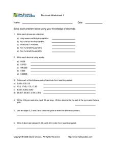 In this decimals worksheet, students write numbers with decimals that are asked of them in these word problems. Students complete 8 problems.