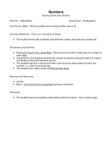 Students identify and write the number 10 and make the number set 10. They interact with the book, "Let's Count It Out, Jesse Bear," by Nancy Carlstrom and discuss how the author made sets of numbers on each page. Utilizing Kid Pix, the...
