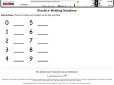 In this writing numbers practice worksheet, students practice writing the numbers 1 through 9 as they trace each number and then write it on their own in the 5 spaces provided for each number. In addition, students practice forming a...