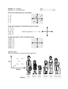 In this coordinate plane learning exercise, 10th graders solve and graph 21 different problems that include various pairs of points. First, they write the ordered pair for each point on the first grid. Then, students name the quadrant in...