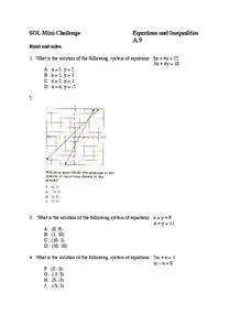 In this equations and inequalities worksheet, 9th graders solve and graph 8 different problems that include various systems of equations. First, they determine the solution to each set of system of equations. Then, students graph the...