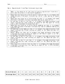 In this intersecting lines worksheet, 10th graders identify and complete 10 different problems that include equidistant intersecting lines. First, they write the equation of the locus of points equidistant from the x-axis and the y-axis...