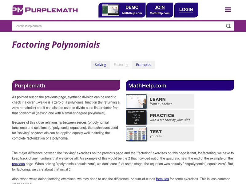 Purplemath: Factoring Polynomials: How To