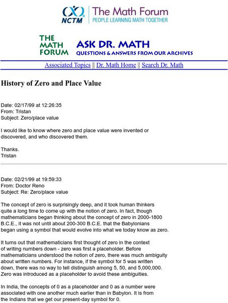 This ask Dr. Math question about the history of zero and place value. Includes a very in-depth answer explaining where zero came from and how it was originally used as a place holder.