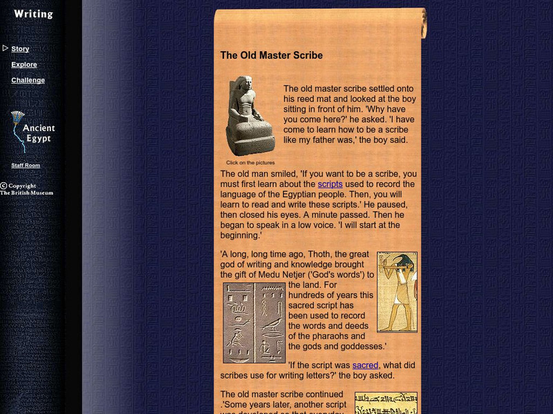 A fictional story that shows the difference between different types of ancient Egyptian writing which is set in ancient Egypt as a young boy learns to scribe from a master scribe.