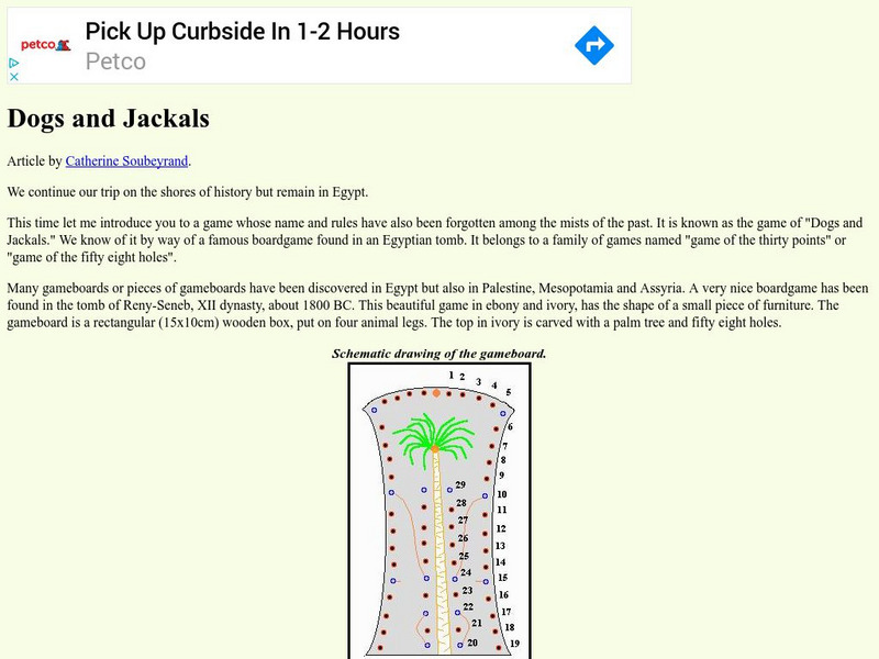 A description of the ancient Egyptian board game known as "Dogs and Jackals". Rules on how to play the game are included along with a picture of the game board itself.