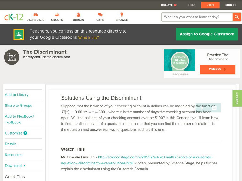 [Free Registration/Login may be required to access all resource tools.] Learn how to use the discriminant to solve problems and determine the number of solutions to quadratic equations.