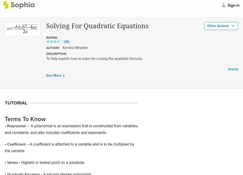 A tutorial on quadratics presents topics including: factoring and solving quadratics, graphing quadratic functions, using completing the square and the quadratic formula to solve functions, the discriminant and conjugates. Plenty of...