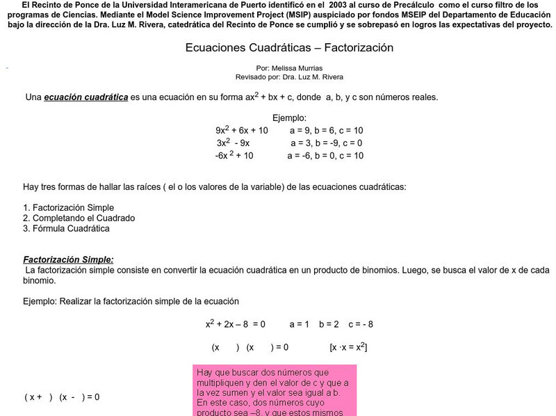 In Spanish. Clear step by step directions, explanations and example problems of quadratic equations. Explains factorization, the quadratic formula, and completing the square.
