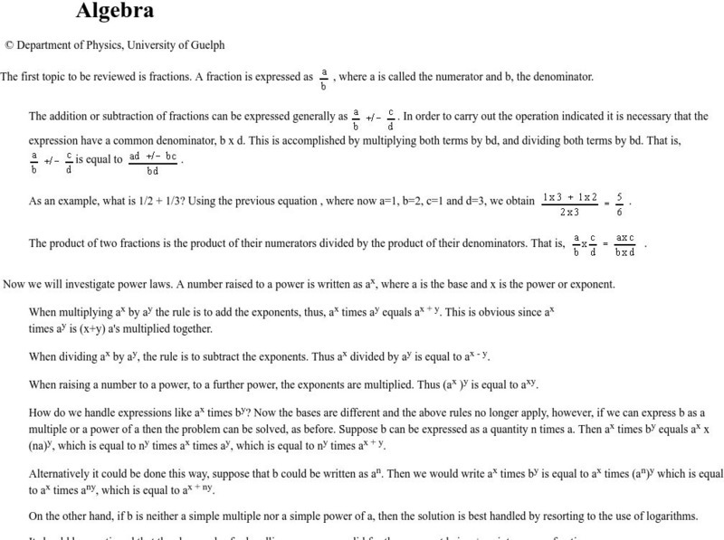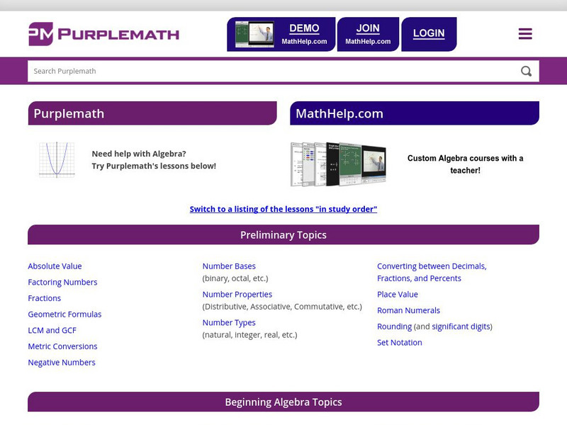 Purplemath contains about 40 different lessons on various algebra topics. The lessons are divided into five different sections: preliminary topics, beginning algebra, intermediate algebra, advanced algebra, and word problems. The lessons...