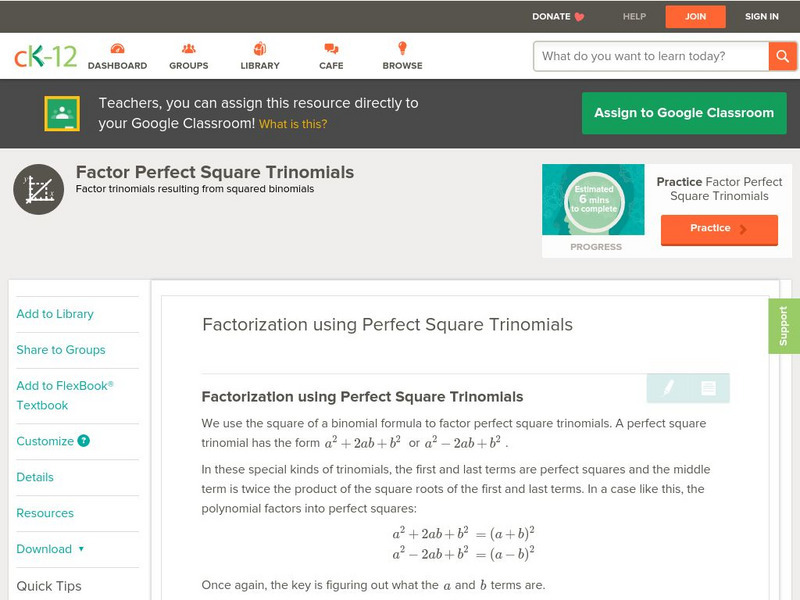 Ck 12: Algebra: Factorization Using Perfect Square Trinomials