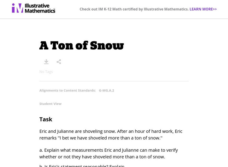 In this task, students are asked to find out how much snow has been shoveled using the concepts of area, depth, density, and rate. Aligns with HSG-MG.A.2.