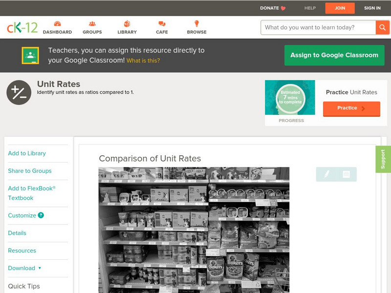 [Free Registration/Login may be required to access all resource tools.] In this lesson, students learn to find unit rates. Students examine guided notes, review guided practice, watch instructional videos and attempt practice problems.