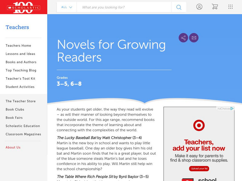 Come and check out this informative resource featuring novels for growing readers. This site lists several appropriate books for students ranging from grades three through six.