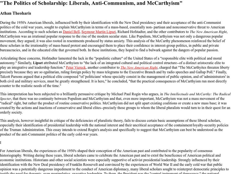 This article contrasts the political versus the cultural anti-communist actions of the McCarthy Era.