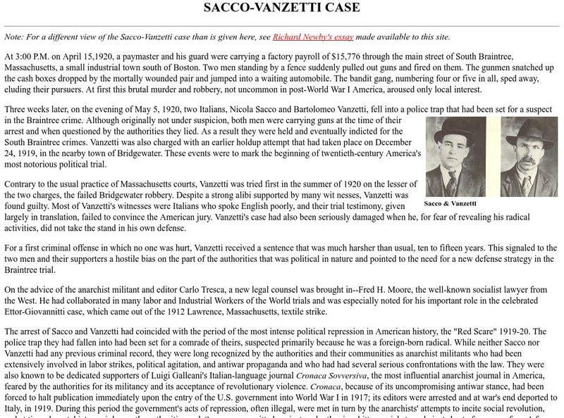 Presents a thorough examination of the Sacco and Vanzetti case. Read about the charges against the men, the trial, and the long-standing controversy surrounding the verdict.