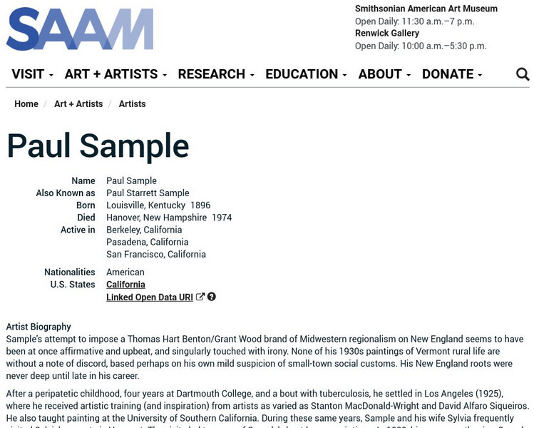 As part of the Smithsonian Art Museum's database of artists, Paul Sample is described here along with information on his contributions to art through his use of regionalism.