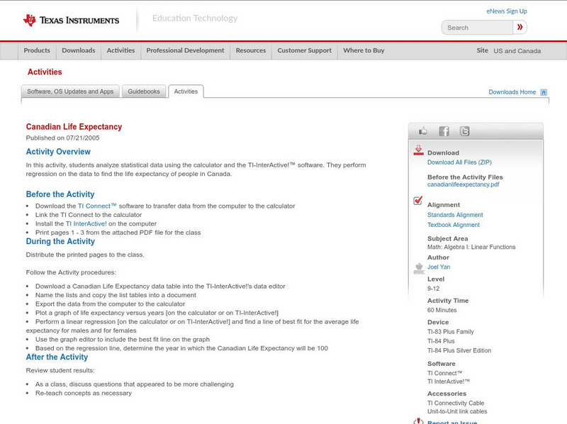 In this activity, students analyze statistical data Using the calculator and the TI-InterActive! software. They perform regression on the data to find the life expectancy of people in Canada.