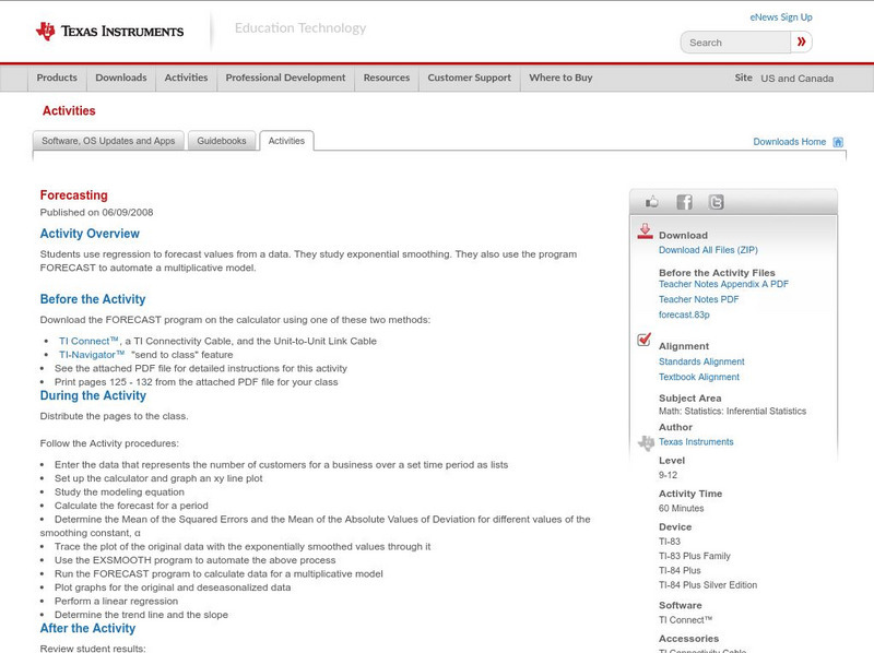 Students use regression to forecast values from a data. They study exponential smoothing. They also use the program FORECAST to automate a multiplicative model.