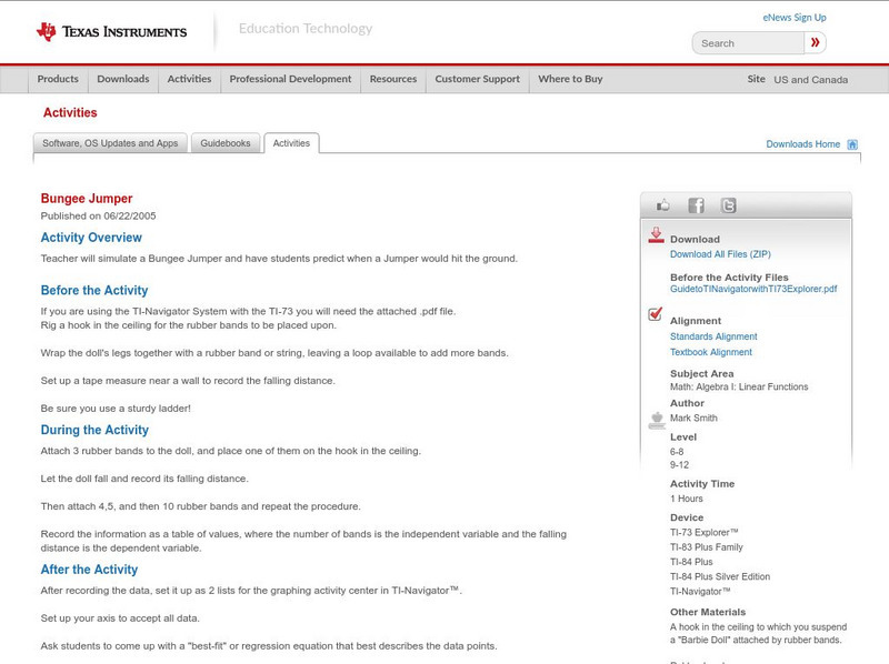 In this activity, students generate data points using the CBR and store them as lists. Then, transfer the lists to the Activity Center to be graphed. The students will attempt to come up with a suitable regression equation.