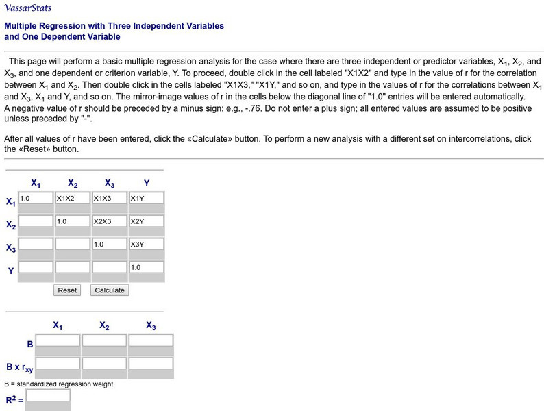 This is an interactive site allowing the student to input data (one dependent and three independent variables) and then letting the computer calculate the regression between these multiple forces.