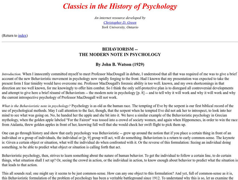Classics in the History of Psychology: Behaviorism the Modern Note in Psychology