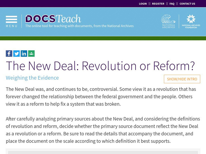 Students will analyze primary sources related to the New Deal. They will analyze specific documents to determine if overall the New Deal represents a revolution or a reform in our history.