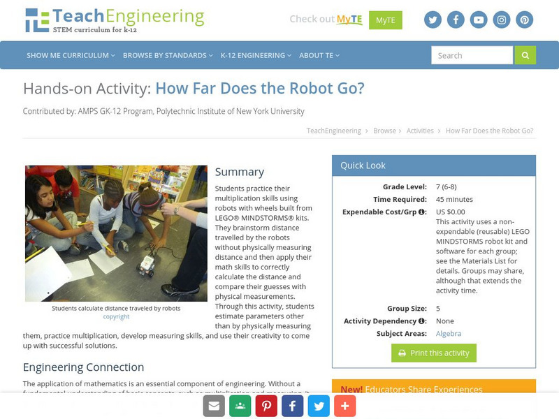 Students practice their multiplication skills using robots with wheels built from LEGO MINDSTORMS NXT kits. They brainstorm distance travelled by the robots without physically measuring distance and then apply their math skills to...