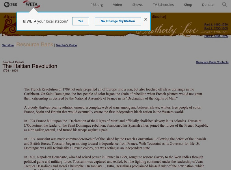 This site, which tells of L'Ouverture's role in the revolution, is part of a larger PBS documentary on Africans in America. Included are a teacher's guide and a narrative of the topic. Also, make sure to use the links at the bottom of...