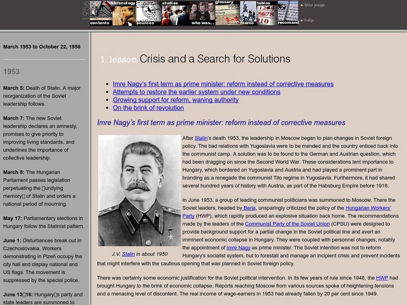 This site examines the events of the Hungarian Revolution. It includes a timeline and glossary of events, people, and groups, and other organizations.