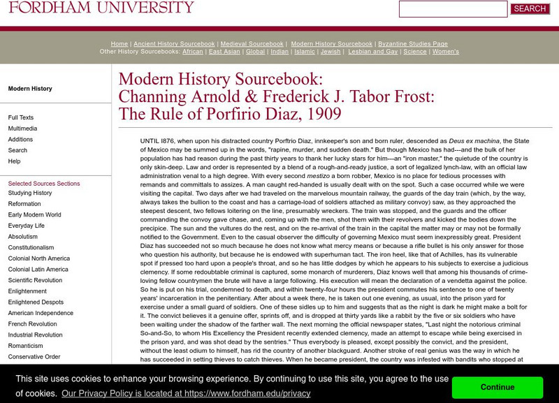 Fordham University provides a discussion on the rule of dictator Porfirio Diaz. It talks about his accomplishments, history, beliefs, brutality, and corruption from the perspective of a contemporary historian of the time.