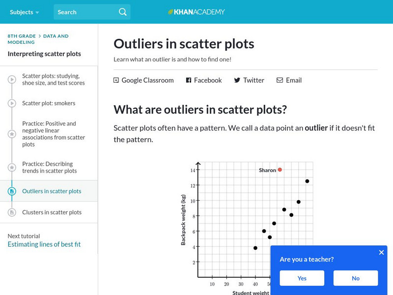 Learn about the points that don't fit the pattern in a scatter plot with this article. Site also includes practice questions to test your knowledge of the topic.