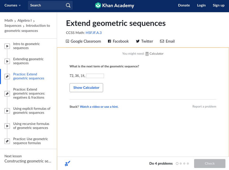 Khan Academy: Algebra I: Extend Geometric Sequences