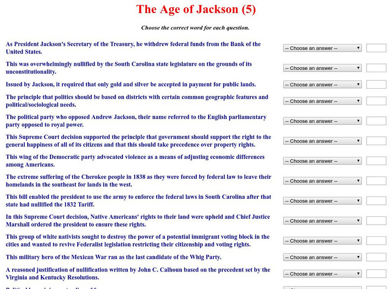 Choose the correct word from the drop down menu for each of the seventeen questions to evaluate your knowledge of the presidency of Andrew Jackson.