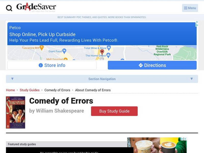 This website provides plot summaries, character profiles, and theme analysis for the Shakespearean comedy, "The Comedy of Errors." The information provided by Grade Saver provides good material to accompany a reading of the play.