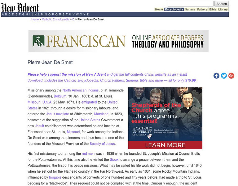 Catholic Encyclopedia provides a biography on Pierre-Jean de Smet, discussing his missionary work. Please note that ?The Catholic Encyclopedia? is a historic reference source and should be viewed in the context of resource material dated...