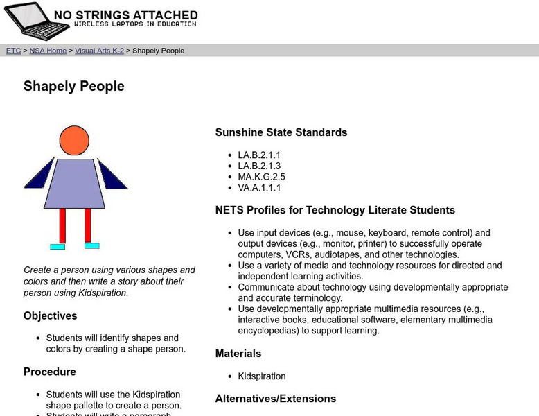 This lesson on shape has learners using the program Kidspiration to create a digital person. The lesson is simple but allows for student imagination. Could be a great introduction to observational drawing.
