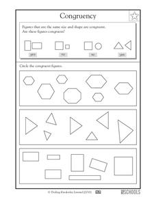 Some of these may look congruent, but examine them closely. There are three sets of shapes here for scholars to analyze as they circle all the congruent figures. For each set, there are three congruent shapes which are oriented in...