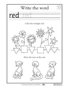 Combine printing practice, shape recognition, and the color red with your kindergartners. They start by tracing the word red and writing it once or twice on their own. Then, they examine an image of flowers and color all the...