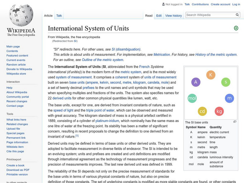 Wikipedia offers detailed information on SI, or the International System of Units. Includes hyperlinked table of contents for easy site navigation.