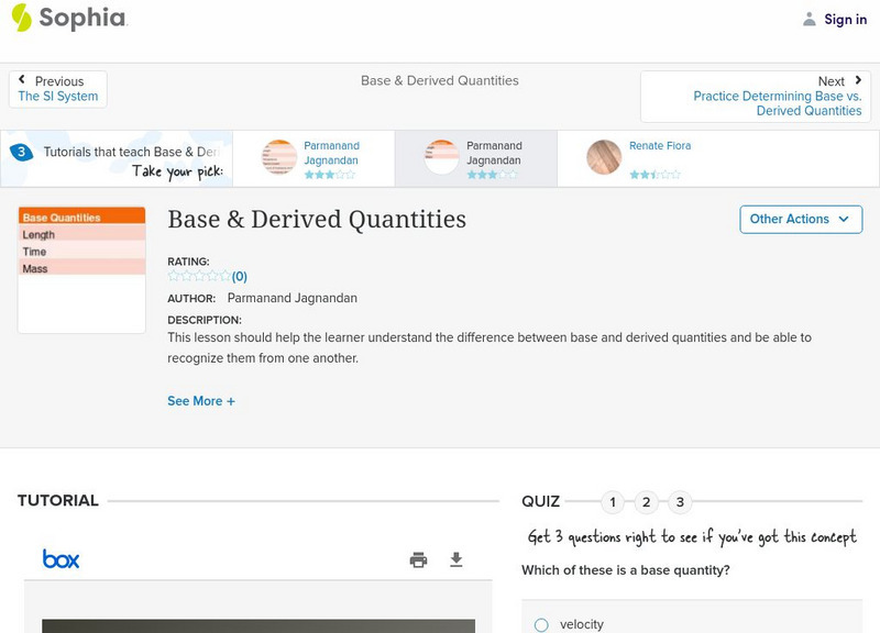This lesson should help the learner understand the difference between base and derived quantities and be able to recognize them from one another. It is 4 of 4 in the series titled "Base & Derived Quantities."