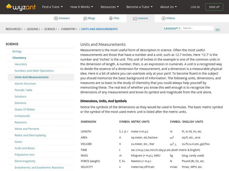 The learning resource discusses units, dimensions, and measures used in Chemistry. Some topics explored are dimension, symbols in metric units and symbols in English units. The activity consists of definitions and explanations.