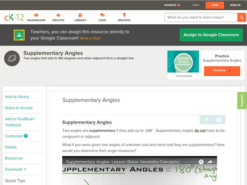 [Free Registration/Login may be required to access all resource tools.] In this lesson students solve complementary angle problems. Students examine guided notes, review guided practice, watch instructional videos and attempt practice...