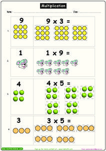 In this multiplication worksheet, 4th graders use the illustrated images to help them multiply the three sets of single digit multiplication problems.