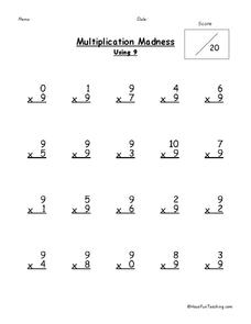 In this multiplication worksheet set, students find the products in 80 single digit multiplication problems. They work with 9 as a factor in each problem.
