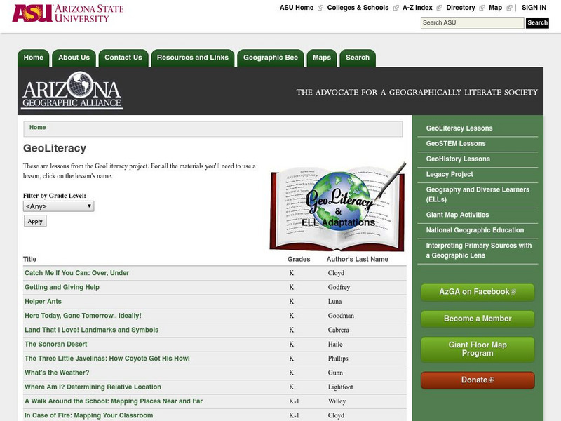 Included in this database are lessons from the GeoLiteracy project. For all the materials you'll need to use a lesson, click a grade level and then on the lesson's name.