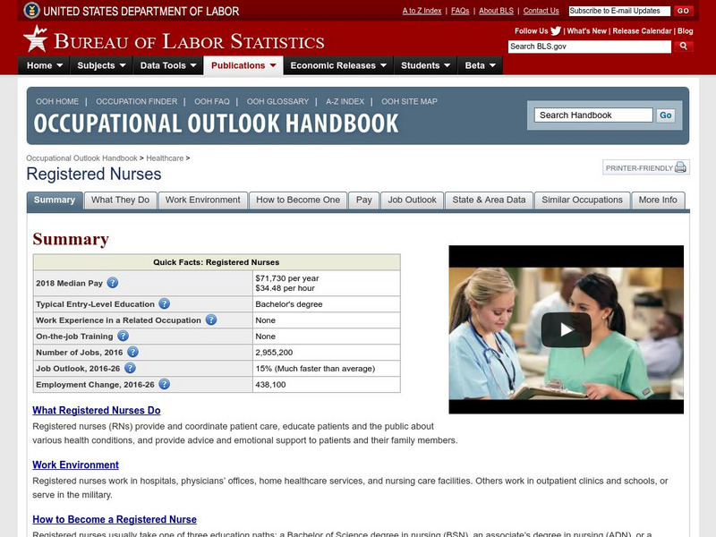 Extensive information about the nursing career as well as information on many other careers. The search engine can be used to find any career listed by the Bureau of Labor Statistics.