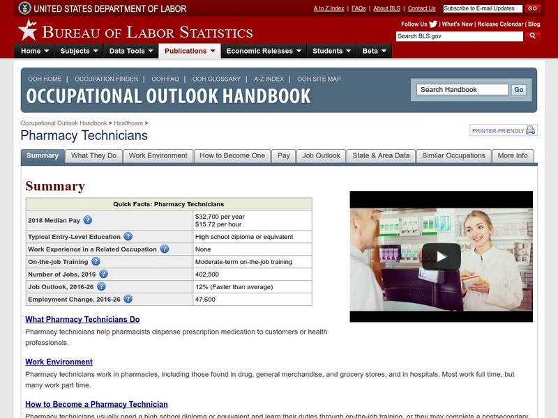 The US Department of Labor site offers substantial information on the Pharmacy Technician Career. Page provides employment projections detailing nature of the work, employment training, job outlook, and earnings potential.