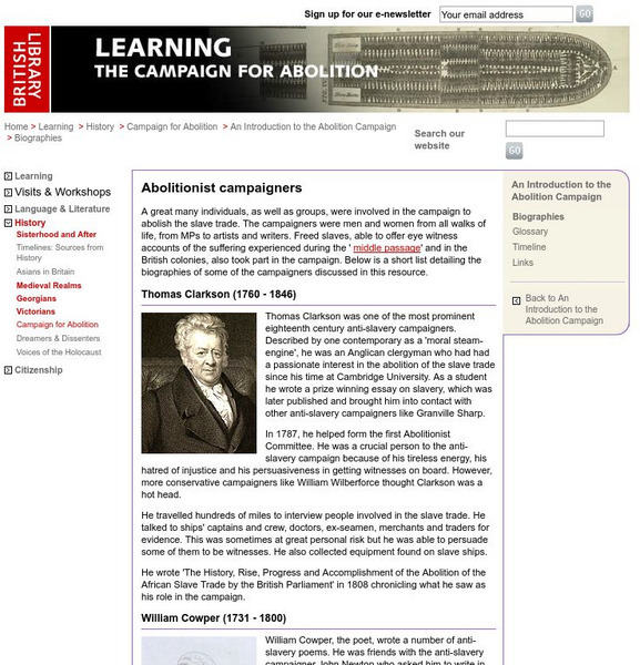 A collection of short biographies of individuals who were involved in the anti-slave trade movement in England during the late 18th and 19th centuries.