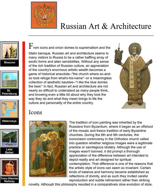 This site from Geographia.com has very detailed information on art and architecture in Russia. Read about religious icons, the modern art movement in Russia, and architecture.